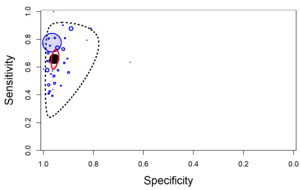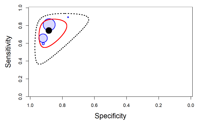 The output from rjags can be used to obtain a plot in the summary receiver operating characteristic (SROC) space with 95% credible region (red line) and 95% prediction region (black dotted line) around the summary estimates of sensitivity and specificity (solid black circle) using the SROC_rjags function found in the DTAplots package. Individual studies can also be represented (blue circles) and are proportional to their sample size. The argument ref_std=TRUEis required to allow the plot to reflect the assumption of a perfect reference test.