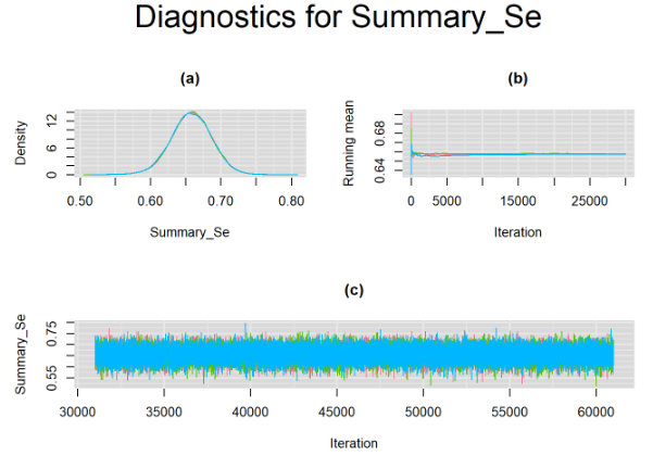 For example, in the figure below, the posterior densities (a), running posterior mean values (b) and history plots (c) for the parameter Summary_Se (summary sensitivity of the Anti-CCP test) are displayed for each chain represented by different color. The similar results from all five chains suggest the algorithm has converged to the same solution in each case.